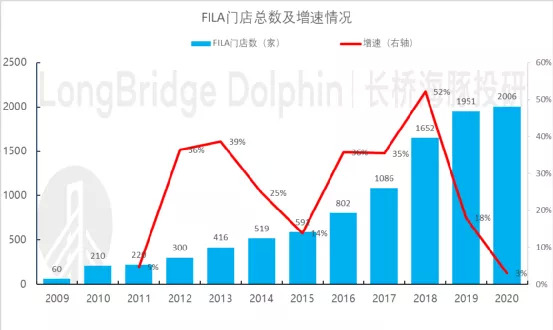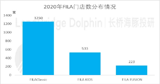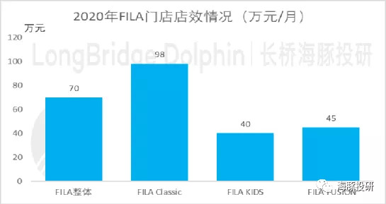 海豚君认为FILA在2021年的增长仍可维持强劲势头,第一是低效门店仍有改善空间,虽然FILA目前整体月店效接近70万,但仍有近40%门店月店效在50万以下(主要是FILA Kids、FILA FUSION)。