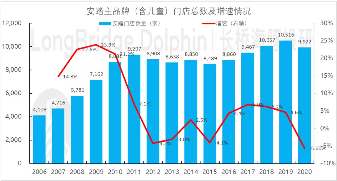 2010年以前,安踏瞄准二三线城市快速扩张门店,2011年开始为了应对行业库存危机,安踏开始调整门店扩张计划,加大去库存力度,关注店效,2011-2015年期间安踏门店数量持平,2016-2019年期间安踏主品牌轻装上阵,稳步扩张门店,2020公司开始向DTC模式转型,加大精细化运营,淘汰部分低效的加盟店。