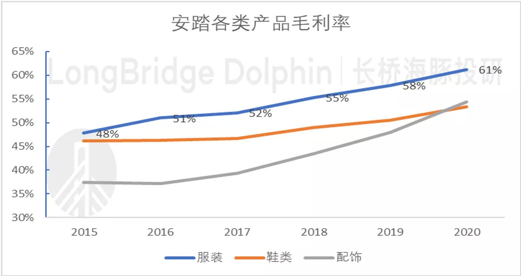 从品类来看,安踏营收主要来自于服装和鞋类,服装毛利率逐步提升,营收占比持续扩大。