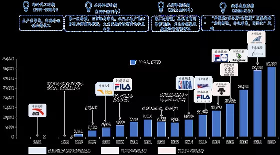 纵观安踏体育历史表现,海豚君大致将其分为“创立初的代工业务、品牌批发时期、品牌化零售运营、全球化战略发展”四个发展阶段,目前处于公司全球化战略略阶段。