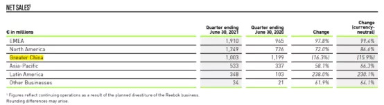 海豚君注意到阿迪达斯于近期披露了2021年第二季度业绩情况,单看整体,阿迪达斯在后疫情时代的恢复非常亮眼。第二季度公司在EMEA地区以及北美都录得强劲的两位数增长,亚太地区也有不俗的表现,但唯有大中华区收入跌幅16%,成为全球唯一一个收入负增长地区。
