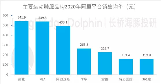 以2020年阿里平台销售价格为例,FILA的价格远超安踏、李宁的传统产品,与阿迪达斯、耐克基本处于同一价位。