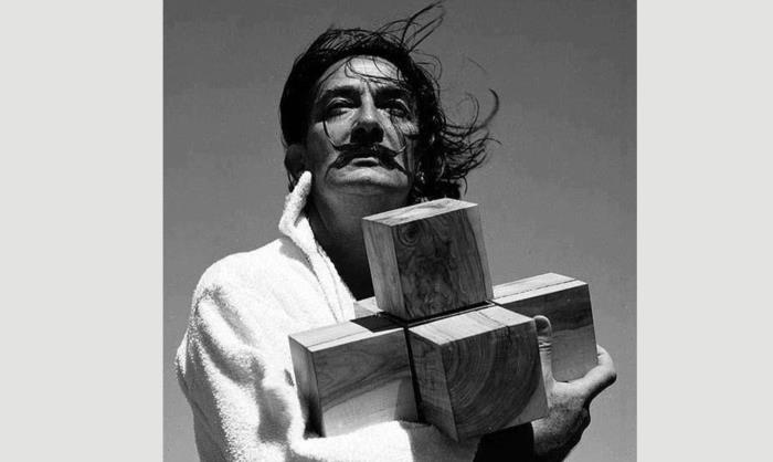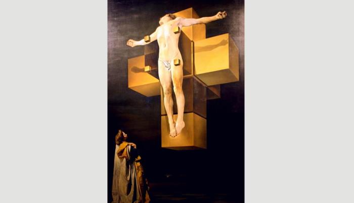 达利直到1989年去世前都在探索理论物理的思想,他1954年的一幅画作最能表现他对于科学的好奇心。耶稣怪异地盘旋在以达利的妻子加拉(Gala)为原型塑造的人物的上空,摆出已经被艺术家们画了数百年的姿势。但是在这幅受难的画中没有钉子,十字架也不是木制的。我们能看到的画面甚至不在一个维度中。