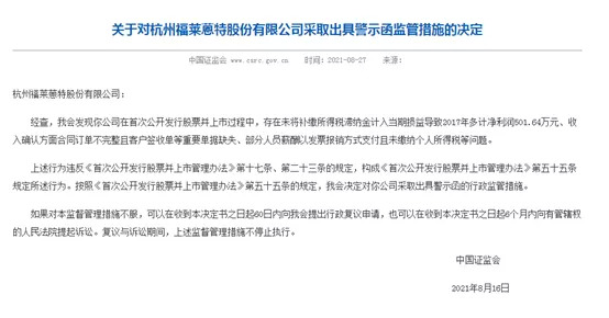 也就是说,在福莱蒽特即将接受证监会面审前不久,其却受到了证监会的警示函。