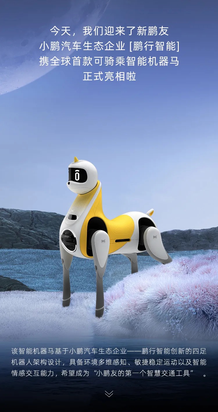 据“小鹏汽车”微信公众号9月7日消息,小鹏汽车生态企业鹏行智能发布全球首款可骑乘智能机器马。小鹏方面介绍,该智能机器马基于四足机器人架构设计,具备环境多维感知、敏捷稳定运动以及智能情感交互能力,希望成为“小鹏友的第一个智慧交通工具”。