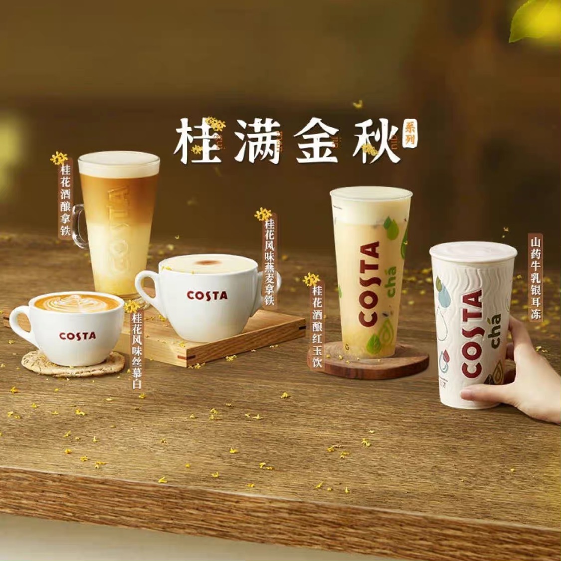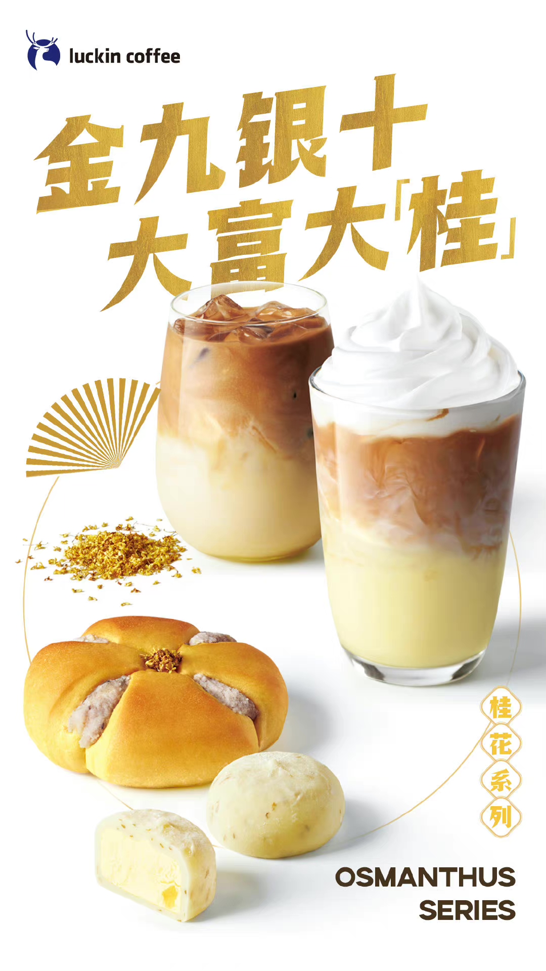 它的起点,是产品更新频率最高的咖啡、茶饮门店。星巴克早在8月就推出了季节限定的“桂花绵云拿铁”;精品连锁咖啡Manner的“桂花燕麦拿铁”“桂花冰拿铁”虽然全年在售,但立秋之后便成为主推产品;Costa咖啡也推出了包含“桂花风味丝慕白”“桂花酒酿拿铁”在内的4款“桂满金秋”系列饮品;瑞幸的“大富大桂”系列,不仅有包括“富桂厚乳拿铁”在内的饮品,也有“金桂芋泥软欧包”和“桂花酪酪大福”这样的烘焙和甜品;肯德基和麦当劳也不甘落后,前者有与故宫联名的桂花风味茶咖,后者的桂花风味产品覆盖了珍珠奶茶、麦旋风、华夫筒冰淇淋、牛角包等7款不同产品。