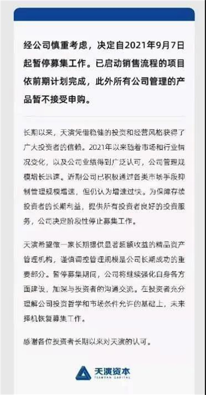 9月7日,天演资本公告称,经公司慎重考虑,决定自9月7日暂停募集工作。已启动销售流程的项目依前期计划完成,此外所有公司管理的产品暂不接受申购。