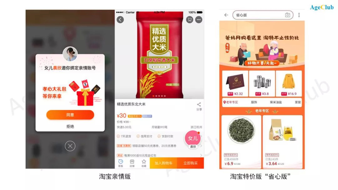 2018年春节期间,淘宝推出了亲情版,由子女建立亲情账号并且选择自己的身份,邀请可能并不太会独立操作 APP 的父母来绑定账号。淘宝亲情版最大的特点是父母可以将商品一键分享给子女,让子女参谋,同时支付场景中增加了子女代支付。