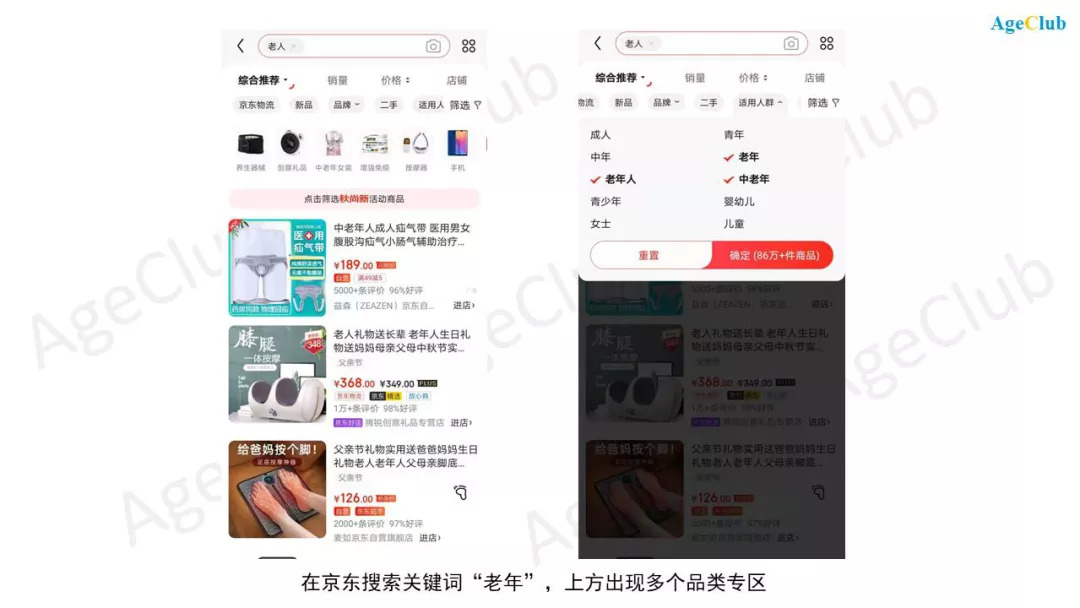 根据AgeClub的观察,京东上老人适用的专区还在调整中,类别不断细化,商品种类也在增加。