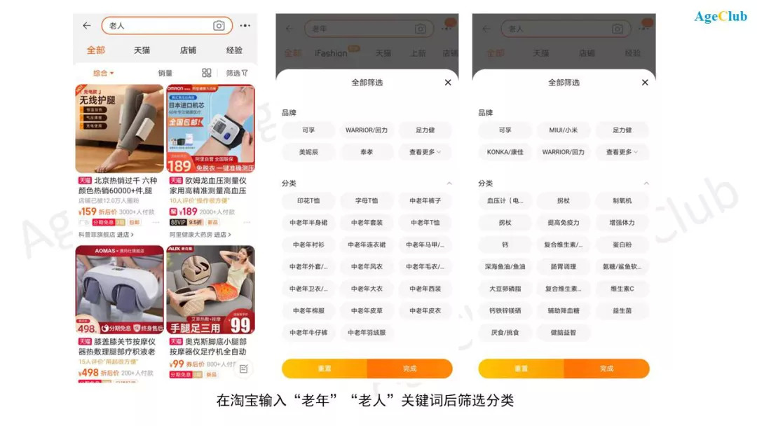 关键词“老年”对应20个中老年服装细分品类,关键词“老人”可以看到健康相关的药品、营养品、拐杖等20个品类。淘宝/天猫的老年商品暂未形成专区,依然处于“人找货”的状态。
