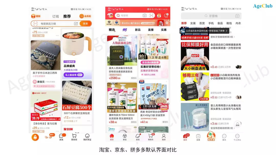淘宝、京东、拼多多正在紧锣密鼓地布局老年市场,上线老年购物专区和专属客服功能。然而,电商平台叠加的金融功能、庞大的商品基数在提供选择的同时,提升了老年人的使用难度。