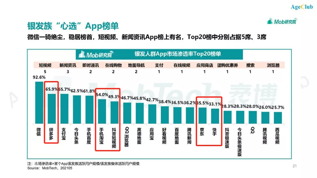 在前文提到的Mob研究院《2021年银发经济洞察报告》中,抖音短视频在银发人群中的渗透率仅次于手机淘宝,快手则仅次于京东。