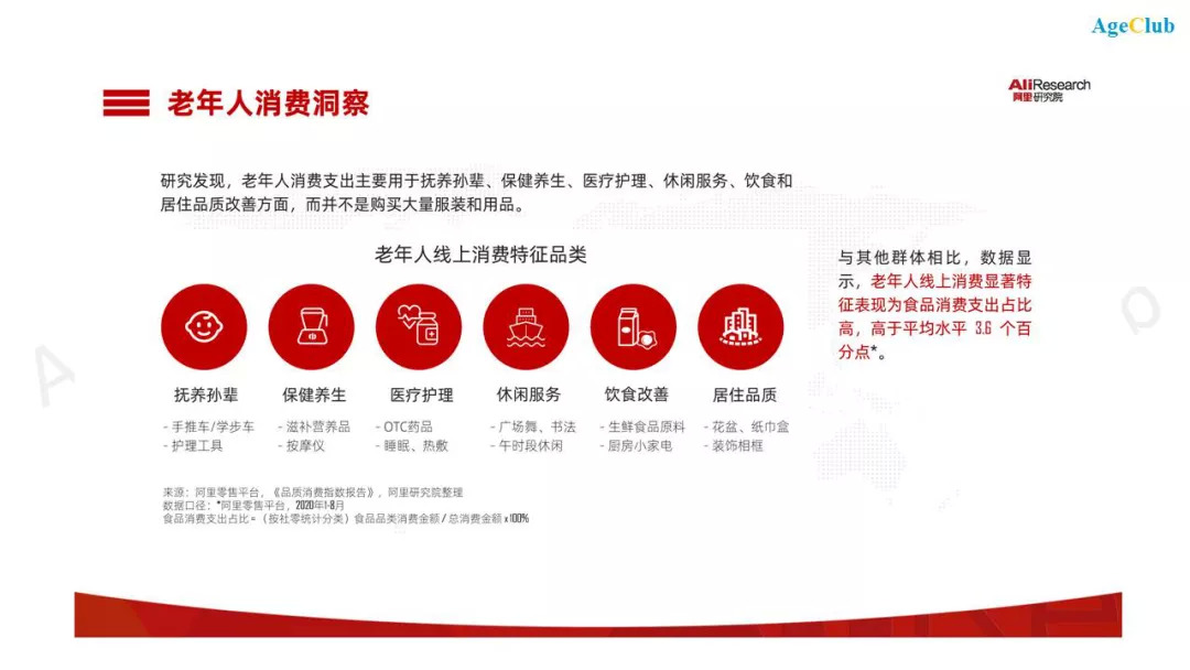 阿里研究院的数据显示,老年人消费支出主要用于抚养孙辈、保健养生、医疗护理、休闲服务、饮食和居住改善方面,并不是购买大量服装和鞋帽。与其他群体相比,老年人线上消费显著特征表现为食品消费支出占比高,高于平均水平3.6%。