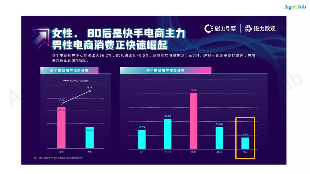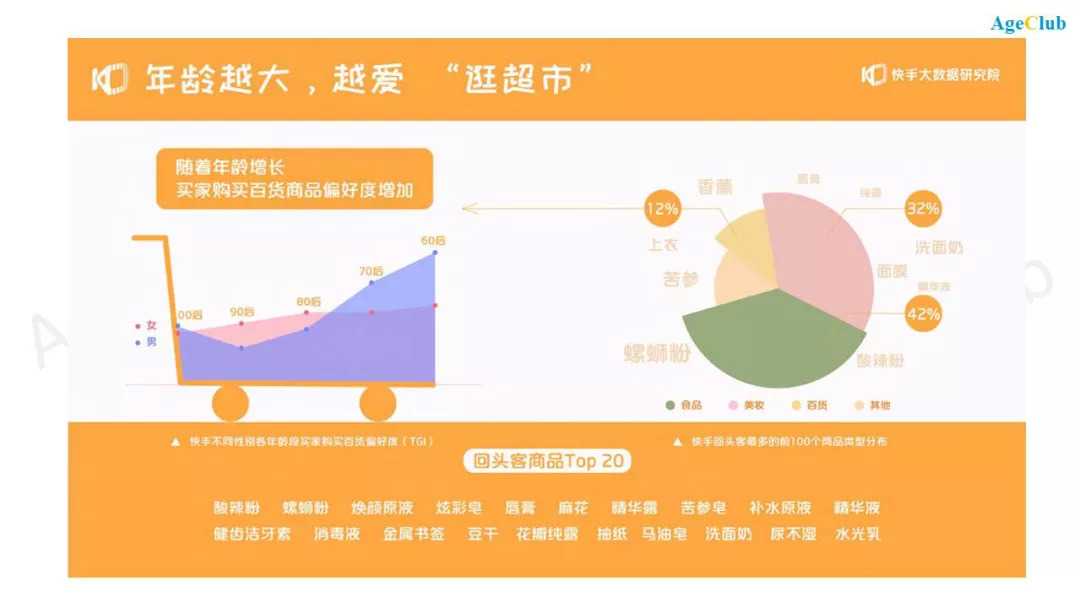 《2021快手电商数据报告》透露,50+用户已经占到了快手电商用户的8.3%,普遍偏爱鞋服和珠宝玉石,其中,女性更加愿意购买美妆个护用品,男性则喜欢下单食品饮料。