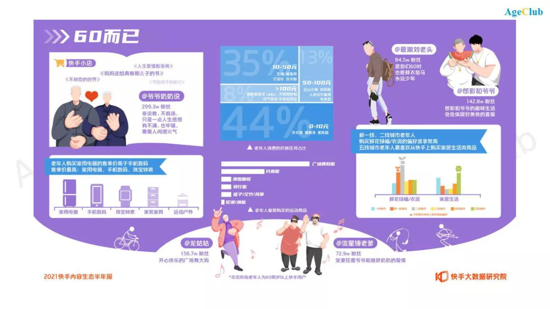 近期快手发布的数据显示,60岁以上快手用户的消费单价不高,92%的快手老年用户消费区间在100元以下,其中消费价格区间在0-10元的占比44%,商品主要为洗衣液、餐具净、老陈醋等。