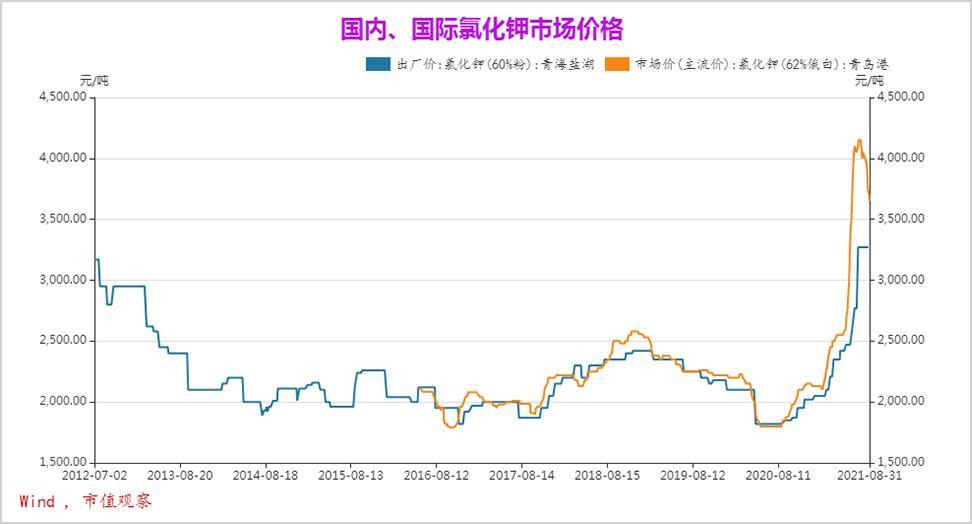 但情况在去年发生了明显的转折,随着经济的复苏和农产品价格的上涨,以及各个国家对于粮食安全的重视程度提高,钾肥市场不断升温。据长江证券的数据,2020年全球氯化钾需求量同比增速高达7.4%,打破了原本的供需平衡格局。除此之外,西方国家对白俄的制裁在一定程度上影响了市场的供给秩序。种种因素叠加在一起,国际钾肥价格被不断推高。
