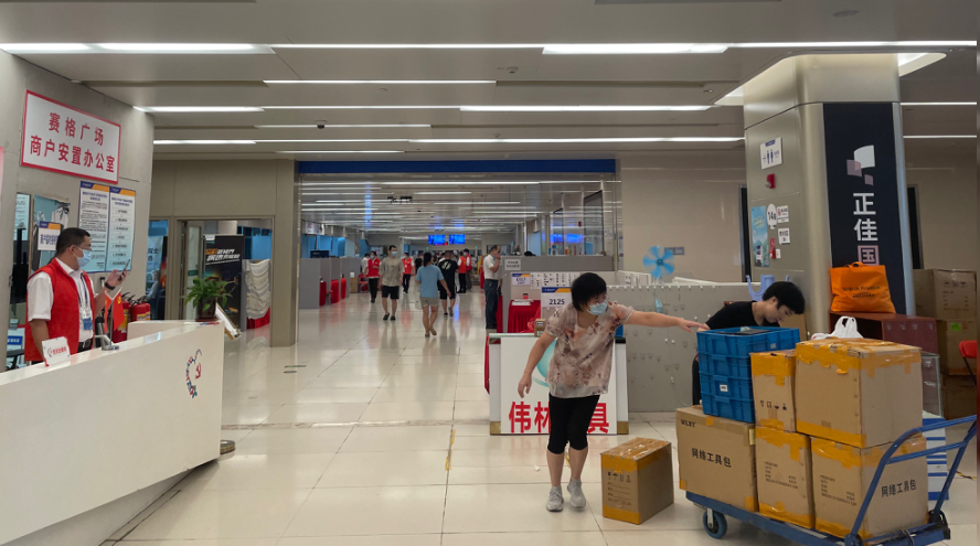9月8日上午10点左右,界面新闻大湾区频道记者来到赛格大厦广场发现,商家们正陆续用小推车把货物搬回大厦。除了保安,现场还有一些穿着红色马甲的工作人员在维持秩序。大厦门口的横幅写着“喜逢回迁开市,欢迎亲人回家”“热烈欢迎业主、商户回家”等标语。大厦内部的一排排电子档口,随着遮尘布被一张张掀开,重新迎来了它们的主人。
