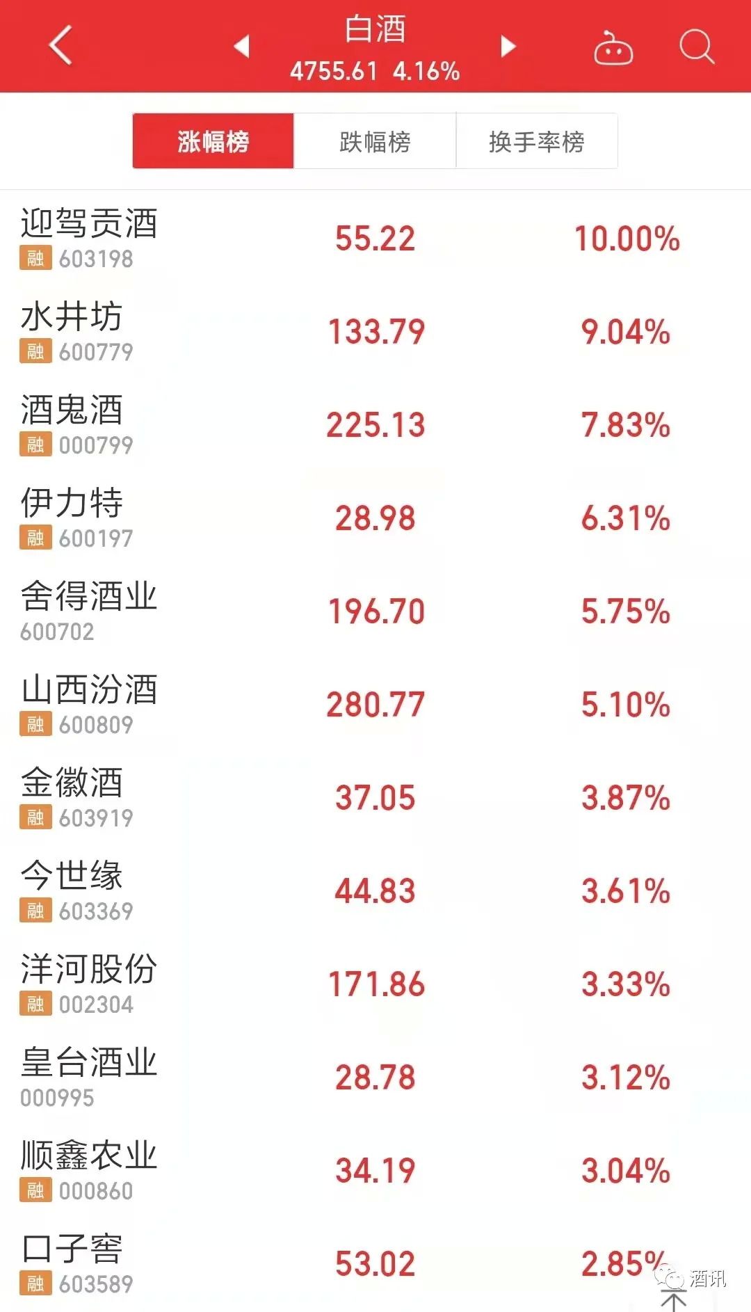 9月6日,白酒板块强势飘红,次高端白酒股更是战力十足。古井贡酒在10点左右就早早封住涨停板;水井坊、酒鬼酒、舍得酒业、山西汾酒均以超5%的涨幅收官。相较而言,“茅五”虽有所上涨,但相对于次高端的涨势,有些差强人意。