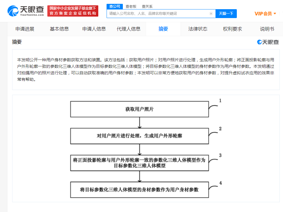 专利摘要显示,本发明通过对拍摄用户的照片进行处理,可以自动获取准确的用户身材参数;本发明可以非常方便地获取用户的身材参数,对提升虚拟试衣应用的效果非常有帮助。