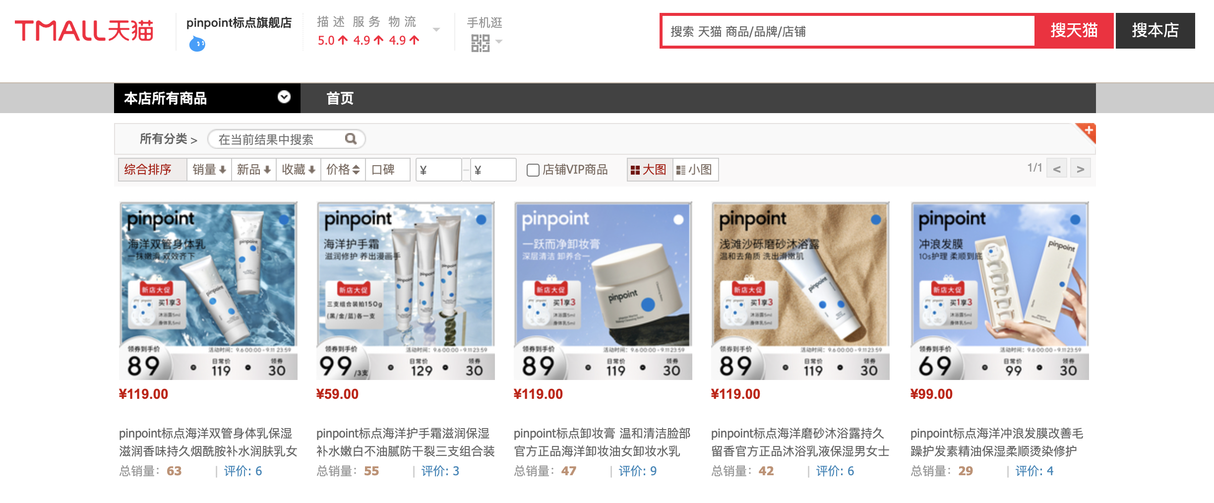 据微信公众号显示,2021年8月pinpoint注册了官方微信公众号,本周刚上线首批新品。目前,pinpoint在微信商城和淘宝旗舰店上线了身体保湿乳、护手霜、卸妆膏、沐浴露、发膜五款产品,原价大约在50元到120元的区间。在新品优惠折扣下,实际产品的到手单价不过百元。