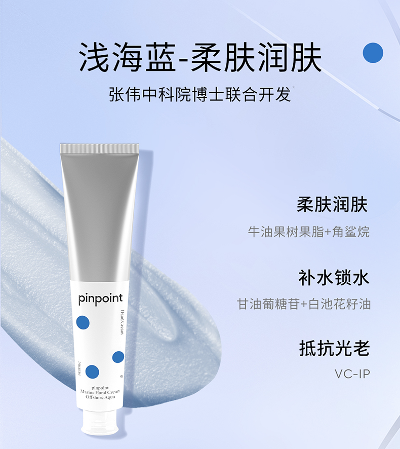 为了强调产品成分配比的功效性,在每个产品的介绍页面,pinpoint都会列出其中所含成分以及相对应的效果。例如,在护手霜产品的图示旁,该品牌列出了牛油果树果脂和角鲨烷来对应“柔软润肤”的功效,以及VC-IP对应“抵抗光老”。