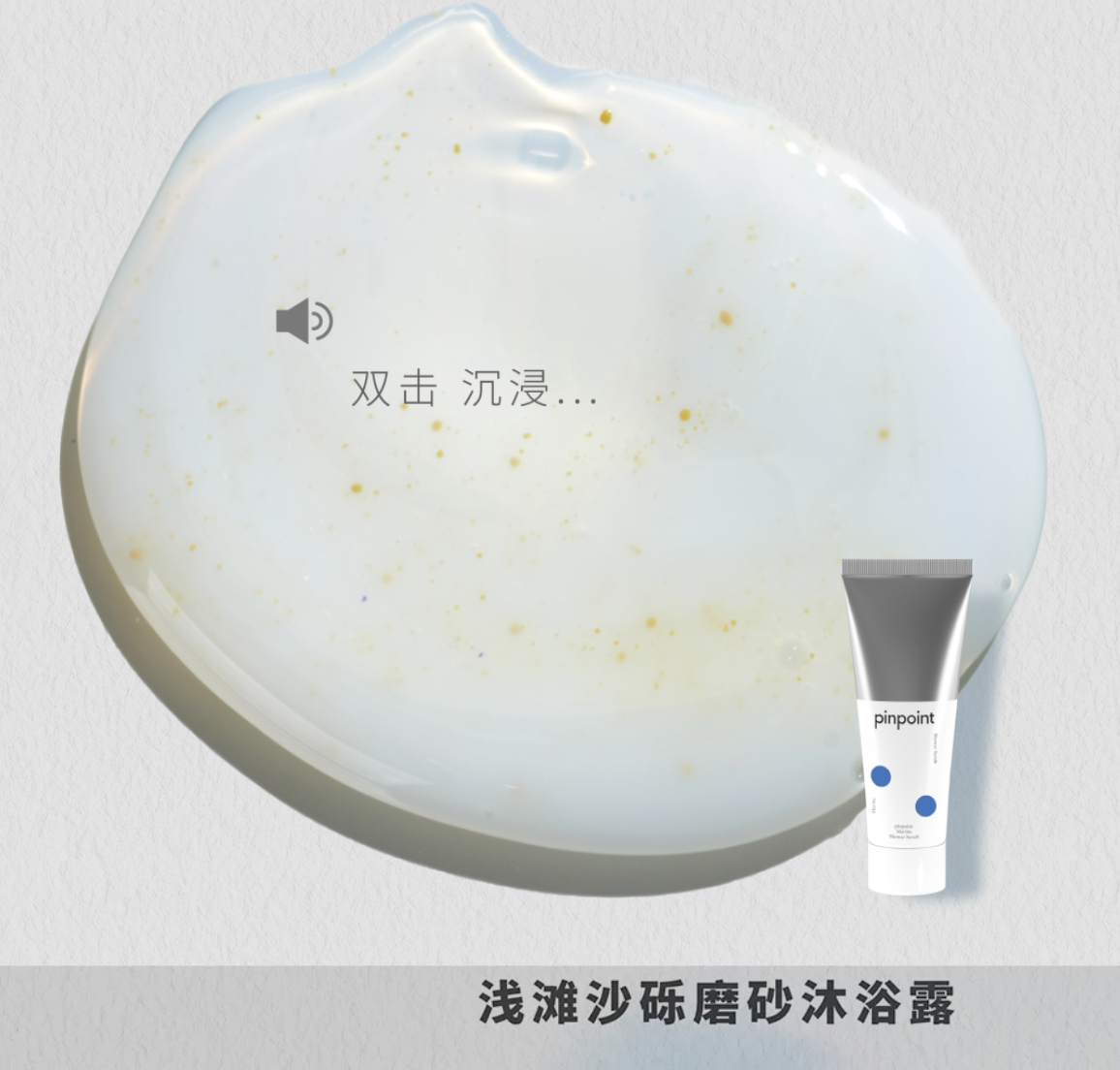 类似的是,pinpoint首批推出的新品均以海洋为主题,其发布的广告则采用了一种类似网络上流行的“ASMR”和“ 沉浸式护肤”视频的形式来具象表达产品质地。在微信推文中,pinpoint录下了每款产品涂抹使用时的声音以供消费者想象。而在短视频中,该品牌则营造了模特在海边使用产品的场景,并在声效上放大了海浪以及产品使用时的声音,以氛围感来吸引消费者的注意力。