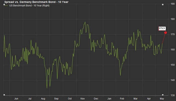 根据FactSet的数据,周三,美国国债收益率上升导致10年期美国国债与10年期德国国债收益率之差扩大至171.5个基点,为3月底以来最大。