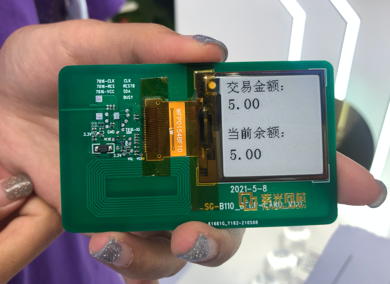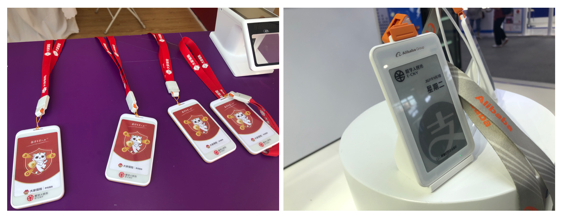 类似的工牌形式同样出现在了紫光电子的展台上,展出的是学生卡。据工作人员介绍:“如果场景打通,学生可以一卡多用,既能紧急联系,也可当作钱包使用。”蚂蚁金服展台上也有智能工牌,据工作人员介绍,该款工牌用电子墨水显示屏代替了纸质名片,既可以作为出入证,也可点击屏幕显示数字人民币的付款二维码。