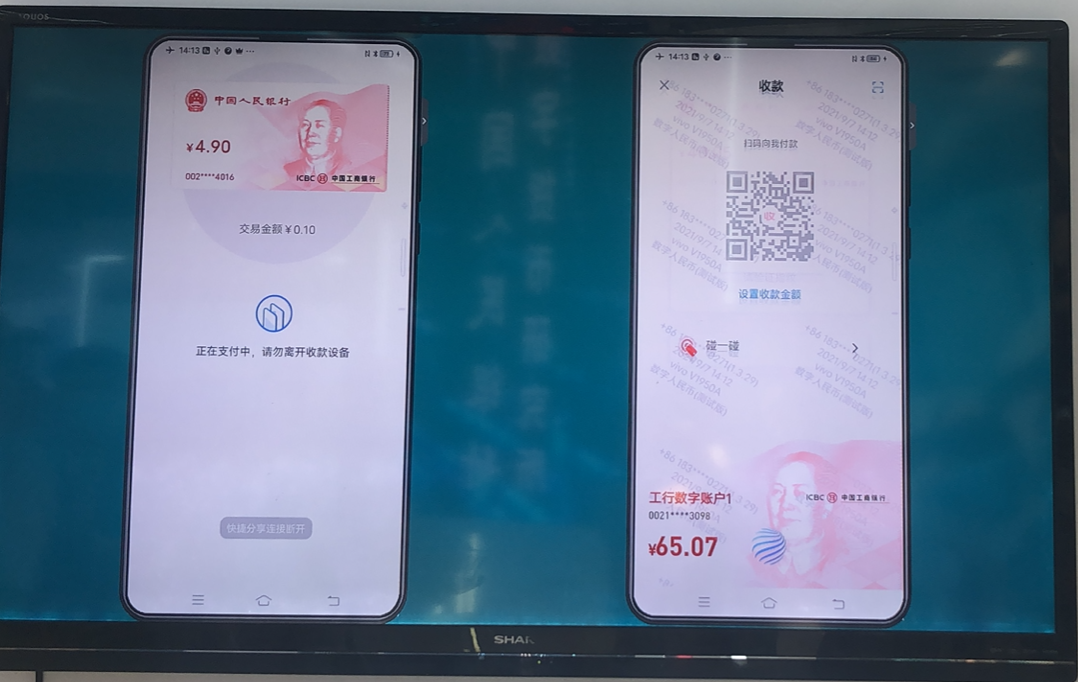 “数字人民币支持双离线支付,手机在无网络、无信号状态下,也能完成支付。”在中国人民银行数字货币研究所展台,工作人员向观众演示,两部都离线的手机如何通过数字人民币完成支付:先在收款手机上设置收款金额,再在另一台付款手机上验证一下指纹,然后将两部手机贴到一起“碰一碰”,一笔双离线支付就完成了。
