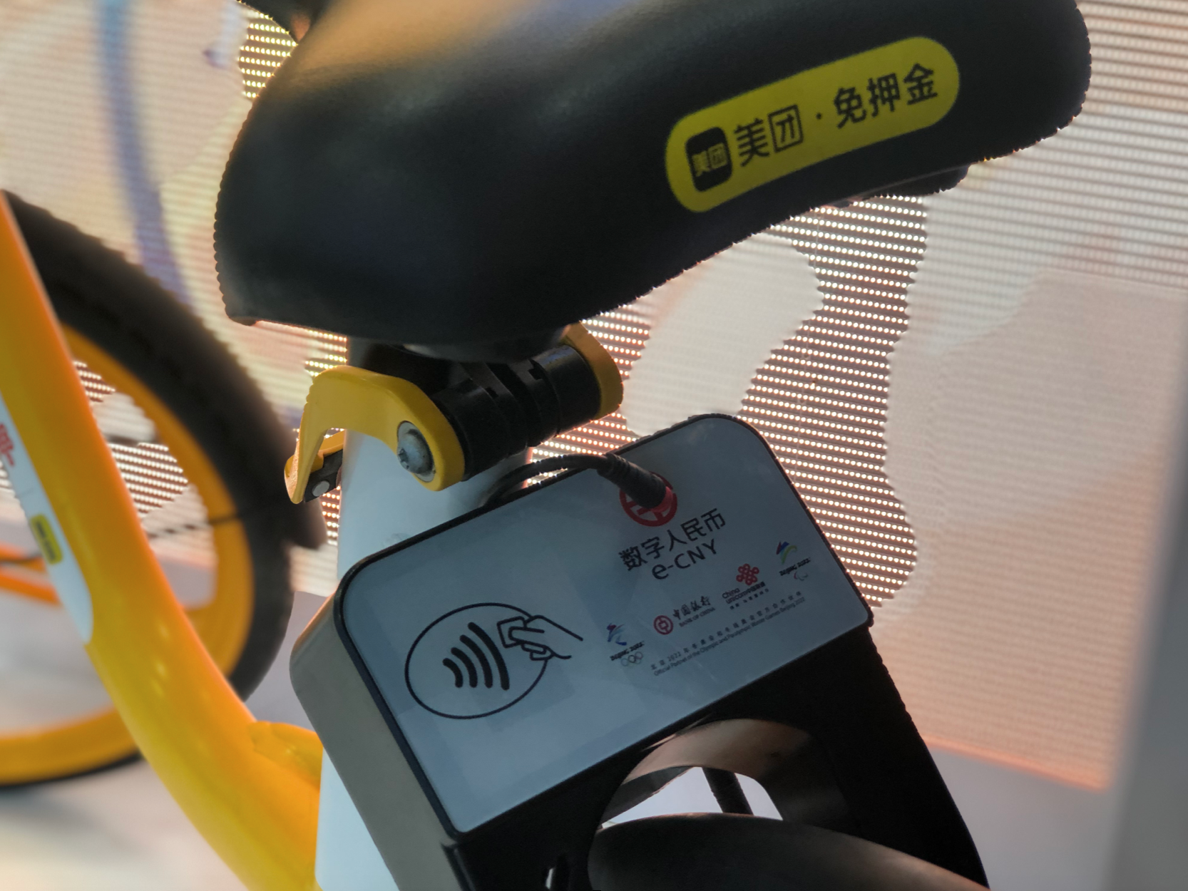 中国银行的展台处则出现了美团共享单车,其座椅背后的智能锁,加入了基于智能SIM卡数字人民币硬件钱包的NFC支付功能,用硬件钱包或者手机“碰一碰”,在无需联网,无需打开手机App,也无需绑定银行卡的情况下,即可开关美团单车,并同步完成付款。