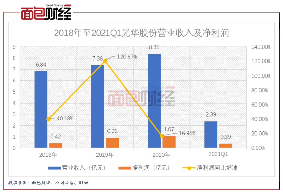 2018年至2021年一季度,光华股份实现营业收入分别为6.84亿元、7.38亿元、8.39亿元和2.39亿元;实现净利润分别为0.42亿元、0.92亿元、1.07亿元和0.39亿元,2020年净利润增速有所下滑。