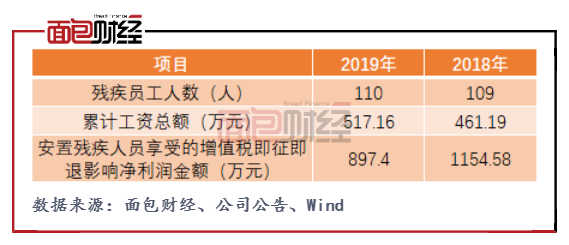 税收优惠中,安置残疾人员享受的增值税即征即退对净利润影响最大。以2019年度为例,截止2019年末,公司残疾员工为110人,占公司员工总数的比例达37.8%,该年度公司因安置残疾人员享受的增值税即征即退金额为897.4万元,占该年度公司税收优惠总额的一半以上。值得一提的是,2019年公司残疾员工累计工资总额仅517.16万元。
