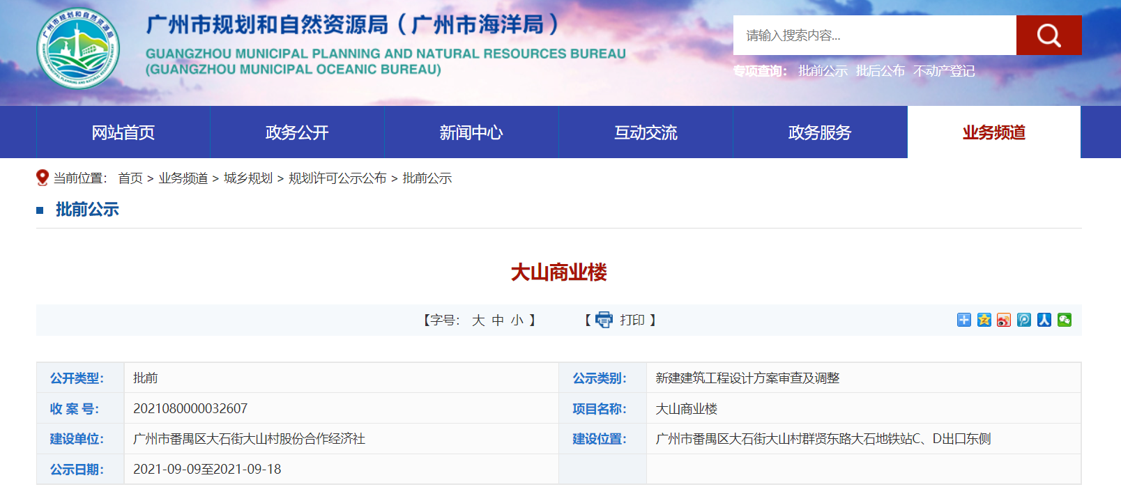 9月9日,广州市规划和自然资源局发布了一则关于大山商业楼规划方案的批前公示,项目是对原规划方案进行调整。