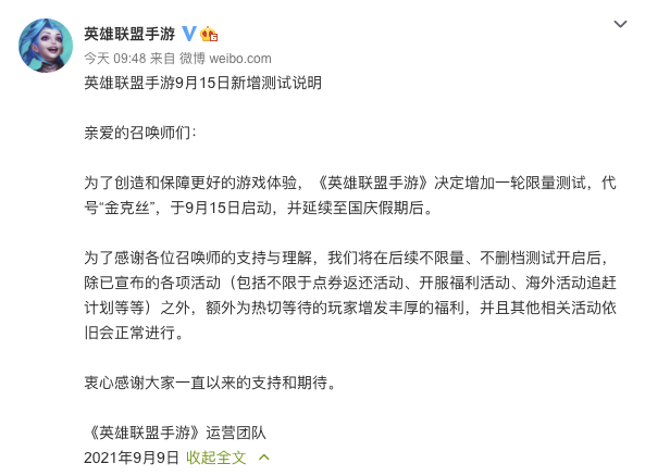 9月9日,《英雄联盟手游》运营团队通过其官方微博发布公告称,为了创造和保障更好的游戏体验,《英雄联盟手游》决定增加一轮限量测试,代号“金克丝”,于9月15日启动,并延续至国庆假期后。