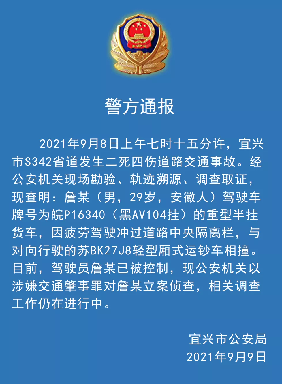 据“平安宜兴”9月9日消息,9月8日上午7时15分许,宜兴市S342省道发生2死4伤道路交通事故。经公安机关现场勘验、轨迹溯源、调查取证,现查明:詹某(男,29岁,安徽人)驾驶车牌号为皖P16340(黑AV104挂)的重型半挂货车,因疲劳驾驶冲过道路中央隔离栏,与对向行驶的苏BK27J8轻型厢式运钞车相撞。