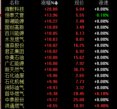 另有12只概念股以10%的幅度涨停。包括新潮能源(600777.SH)、国创高新(002377.SZ)、百川能源(600681.SH)、道森股份(603800.SH)、道森股份(603800.SH)、中曼石油(603619.SH)、广汇能源(600256.SH)等。