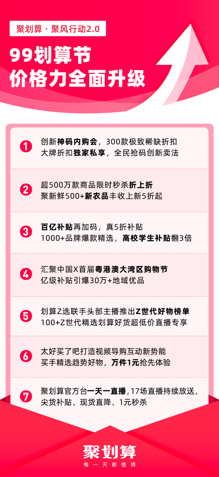 今年的99划算节在9月1日就正式启动。今年,“聚风行动2.0”计划全面升级,深度狙击价格力。除了百亿补贴再加码之外, 还开启了神码内购会、划算Z选好物榜单、官方台直播等多种玩法,致力将稀缺折扣、补贴力度做到极致,发挥平台助农及助力区域经济发展的能力,并于9月8日推出趣味找码的首个盲盒音乐会神马奇妙夜,力争达到价格力和年轻化的双突破。