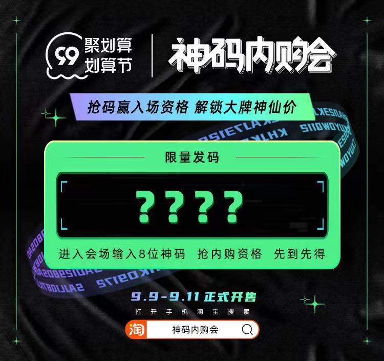 除此以外,今年聚划算还创意性的新增了一个全新玩法:神码内购会。这个具体的形式是将所有优惠力度足够强的拳头产品以‘内购’的形式,放在隐藏会场当中。只有拥有“神码”的人才能够进入会场,一窥今年99划算节的全貌。