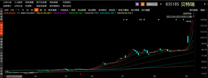 9月9日,新三板精选层个股贝特瑞(835185.NQ)开盘继续大涨,盘中股价一度触及148.08元/股,市值突破700亿元。