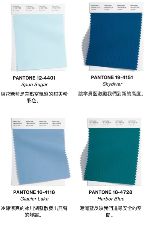 比如,从十种流行色的色盘中可以看到四种深浅不一的蓝色,“棉花糖蓝(Spun Sugar)”和“跳伞员蓝(Skydiver)”传递出了一种甜美和激动的积极氛围,而“冰川湖蓝(Glacier Lake)”和“海港蓝(Harbor Blue)”则表现出了沉静安详的安全气息。