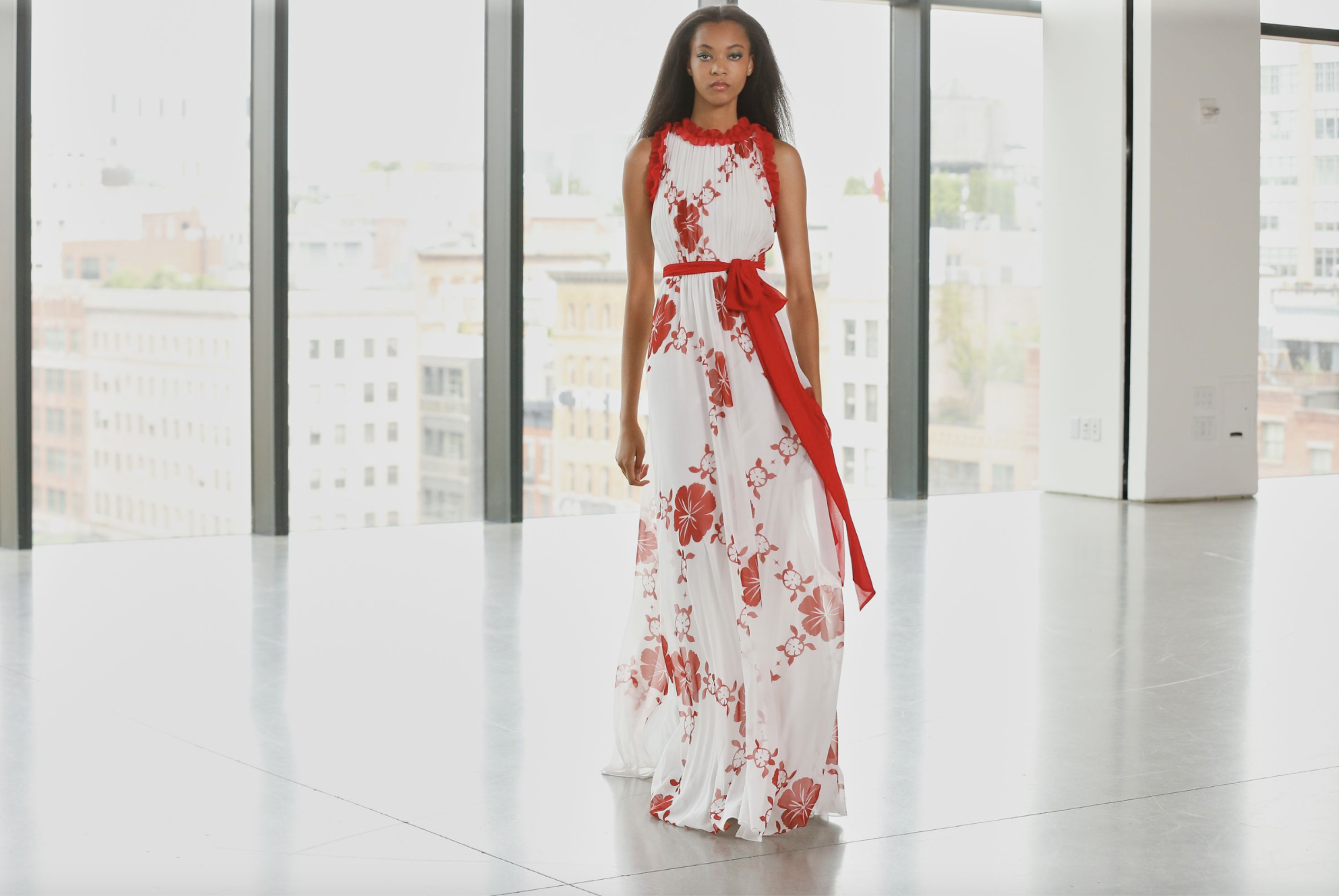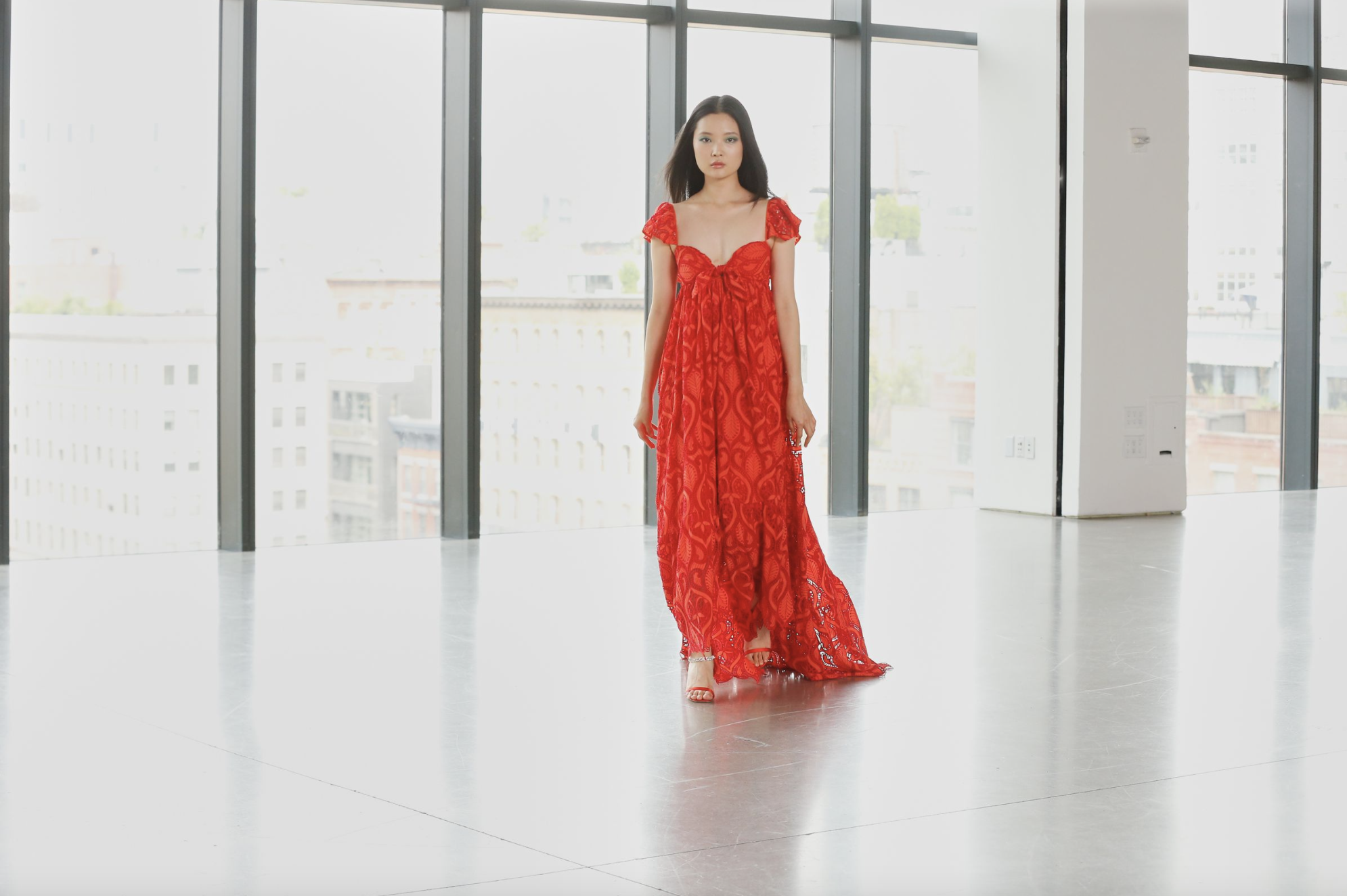 彩通将凤凰木红形容为一种极具戏剧化效果的强力火红色。从单色的裙装上就可以感受到一种靓丽逼人的气势感,但如果和白色相融合则会被调和地更为清新明媚。