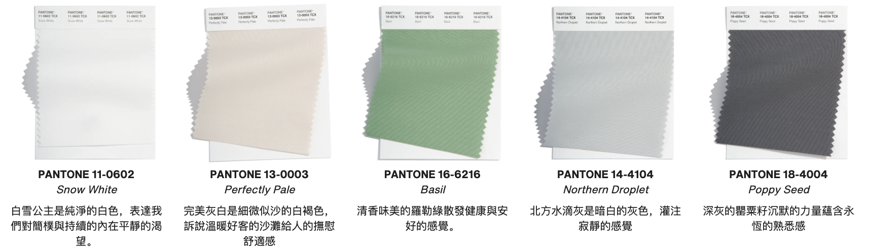 此外,彩通列出的五个经典色分别为“白雪公主(Snow White)”、“完美灰白(Perfect Pale)”、“罗勒绿(Basil)”、“北方水滴灰(Northern Droplet)”和“罂粟籽灰(Poppy Seed)”。