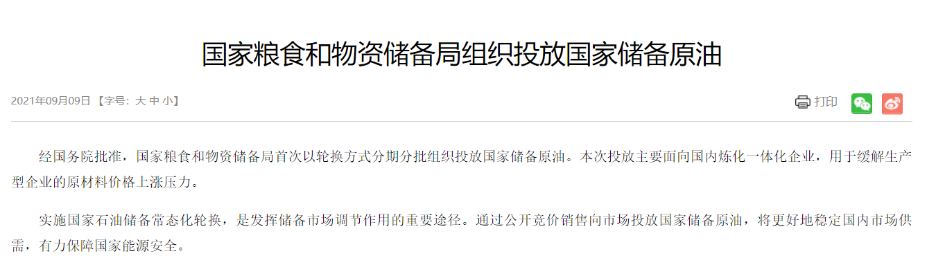 据国家粮食和物资储备局官网9月9日消息,经国务院批准,国家粮食和物资储备局首次以轮换方式分期分批组织投放国家储备原油。本次投放主要面向国内炼化一体化企业,用于缓解生产型企业的原材料价格上涨压力。