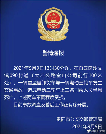 @贵阳交警 微博9月9日消息,贵阳市公安交通管理局通报,今日13时30分许,一辆重型自卸货车与一辆电动三轮车发生交通事故,造成电动三轮车上三名司乘人员当场死亡,上述两车不同程度受损。目前,事故调查及善后工作正有序开展。