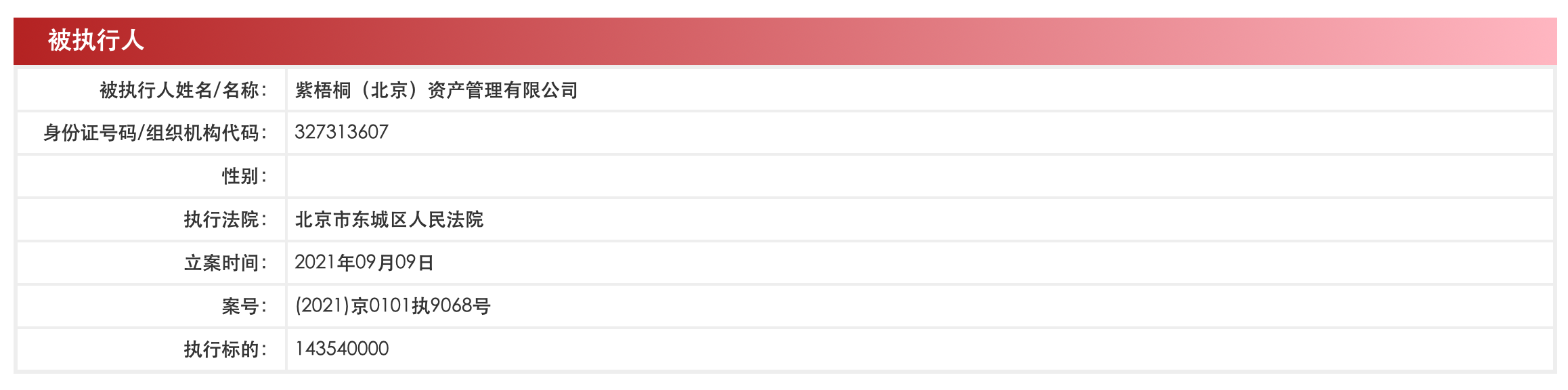据中国执行信息公开网显示,近日,蛋壳公寓关联公司紫梧桐(北京)资产管理有限公司新增被执行人信息,案号(2021)京0101执9068号,执行标的1.4354亿元,执行法院为北京市东城区人民法院。据天眼查APP显示,截至目前,该公司被执行总金额超1.8亿元。