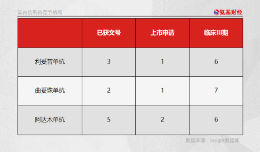 根据Insight数据库,目前复宏汉霖三款仿制药竞争格局比较激烈,包括已获文号、上市申请、Ⅲ期临床阶段在内的药企数量均达到两位数。