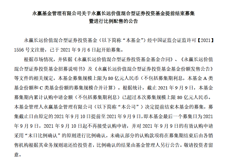 9月9日,永赢基金发布公告称,永赢长远价值混合基金累计有效认购申请金额(不包括利息)已超过本次募集规模上限人民币80亿元。公司决定提前结束该基金的募集,并对9月9日的有效认购申请采用“末日比例确认”的原则予以部分确认。