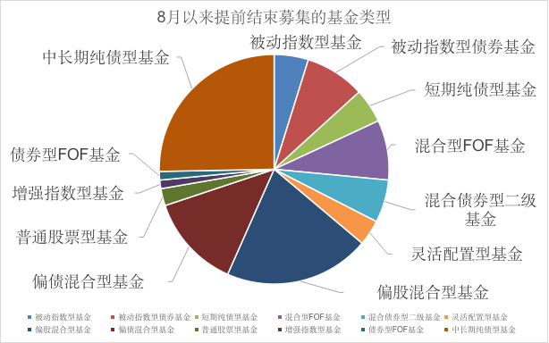 根据wind数据统计,8月以来共有274只新基金成立,其中有83只基金宣布提前结束募集。具体来看,其中短期纯债、中长期纯债、混合债券型基金有32只,偏股混合型基金有17只、偏债混合型有11只、被动指数型债券基金7只,另外还有7只FOF基金。