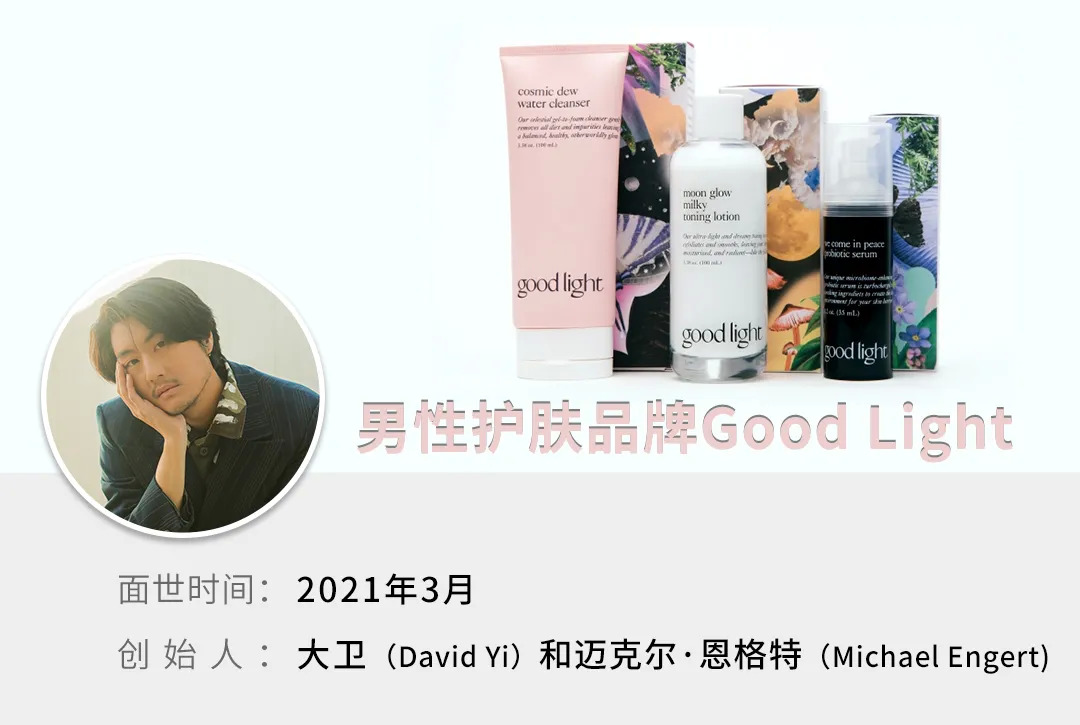 流行男性美容杂志《Very Good Light》的创始人、《Pretty Boys》作者大卫(David Yi)与专业防晒品牌Supergoop前DTC主管迈克尔·恩格特(Michael Engert)共同创办了护肤品牌Good Light。经过两年的研发和产品开发,Good Light于2021年3月发布了三款产品。