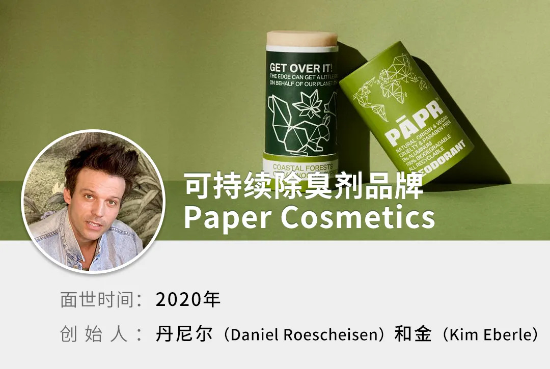 经过约两年的产品开发,Daniel Roescheisen和Kim Eberle于2020年推出了可持续除臭剂品牌Paper Cosmetics(PāPR Cosmetics),品牌坚持零浪费、零残忍与纯素,目前已推出五款除臭剂。